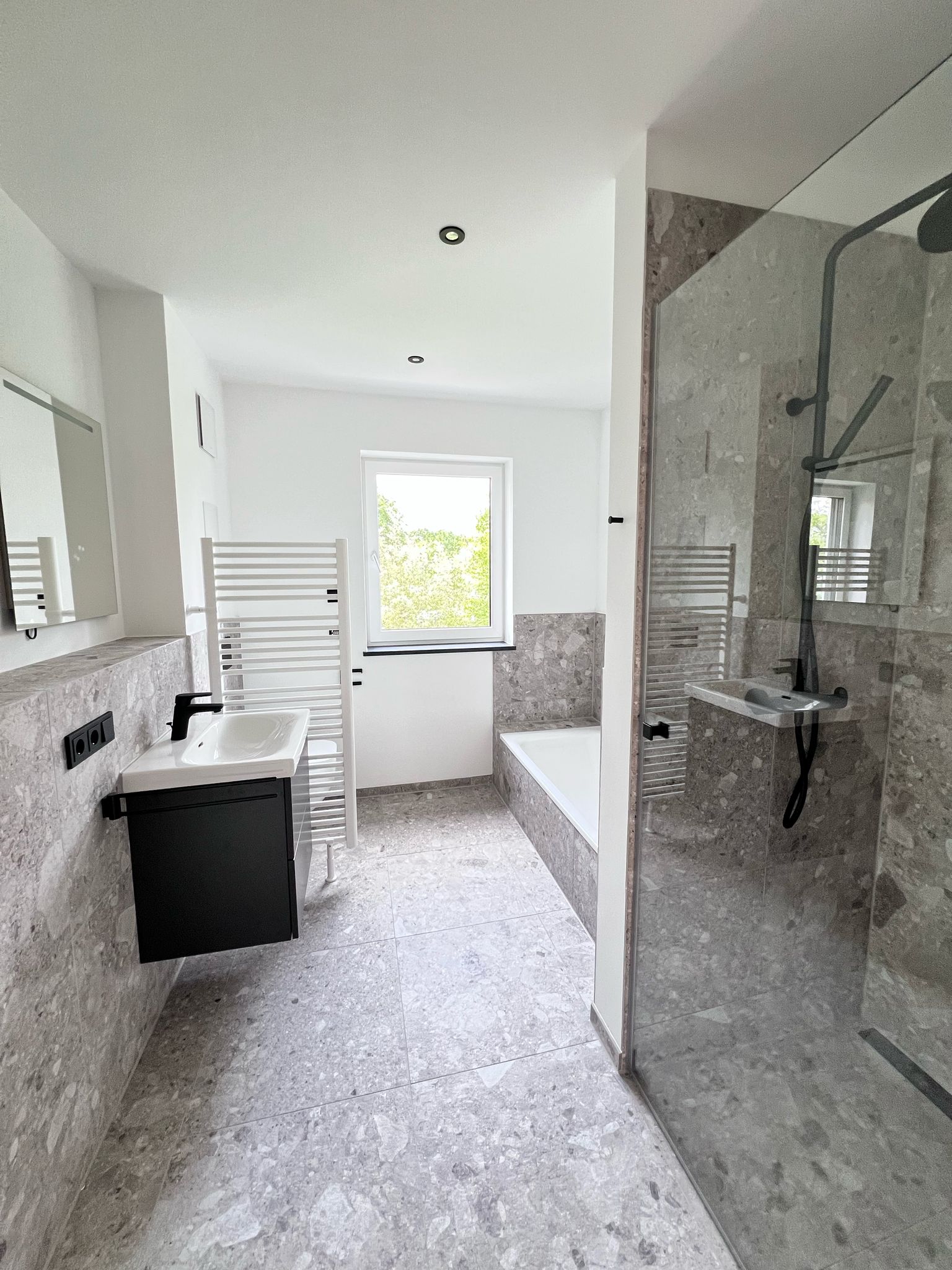 Das Tageslichtbad, welches mit einer bodengleichen Dusche, einer Badewanne, einem Waschbecken, einem WC sowie einem Waschmaschinenanschluss versehen ist, wurde mit hochwertigem Feinsteinzeug verlegt.