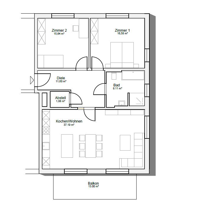 Auf der Rechten Seite gelangen Sie in den großzügigen Koch-/Ess- und Wohnbereich mit Zugang zum ca. 13 m² großen Balkon (in der WFL mit 50 % berechnet).