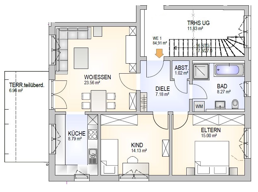 Rechter Hand gelangen Sie in einen offenen Wohn- und Essbereich mit Zugang zur Terrasse mit ca. 6,96 m². Angrenzend zum Wohnbereich befindet sich die Küche.